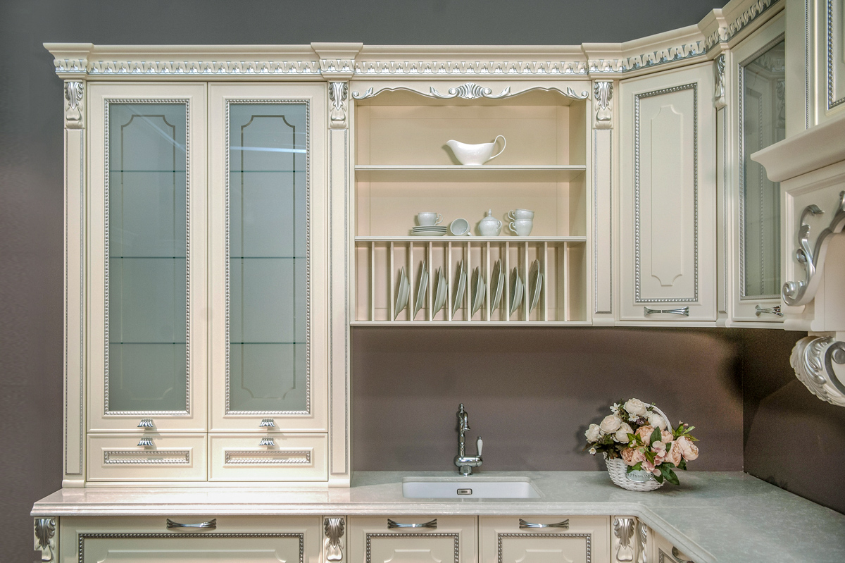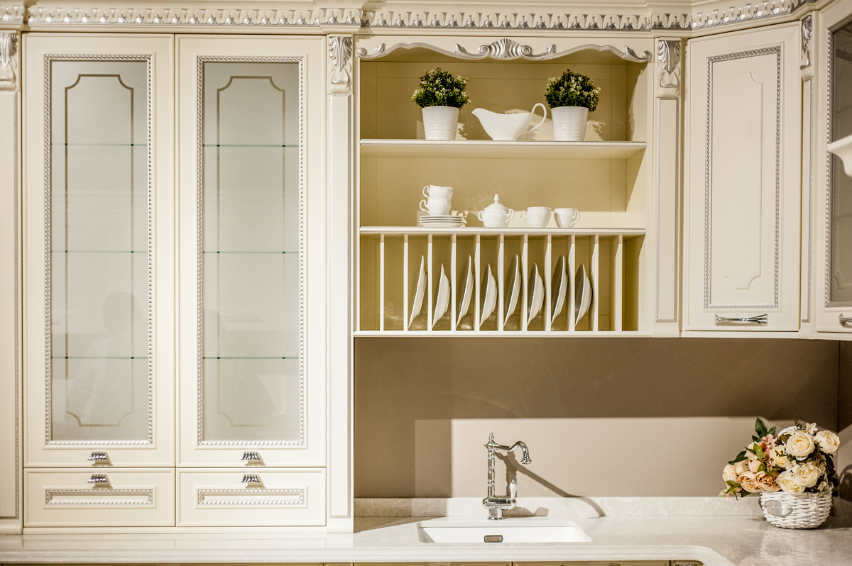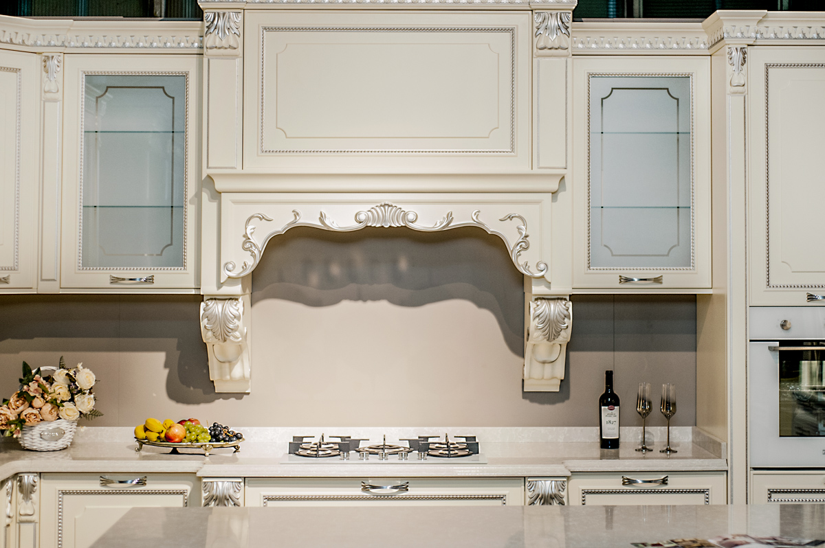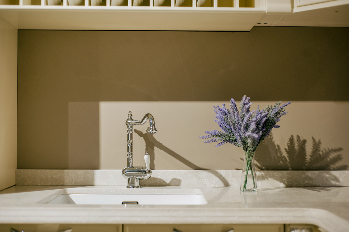 O bucătărie cu nuanțe de culori deschise, combinată ornamente decorative ce ii oferă un aspect respectuos și comod pentru a găti.