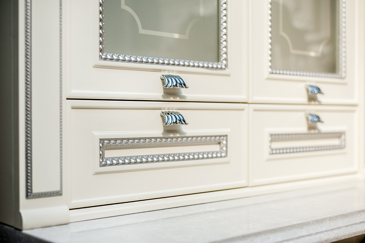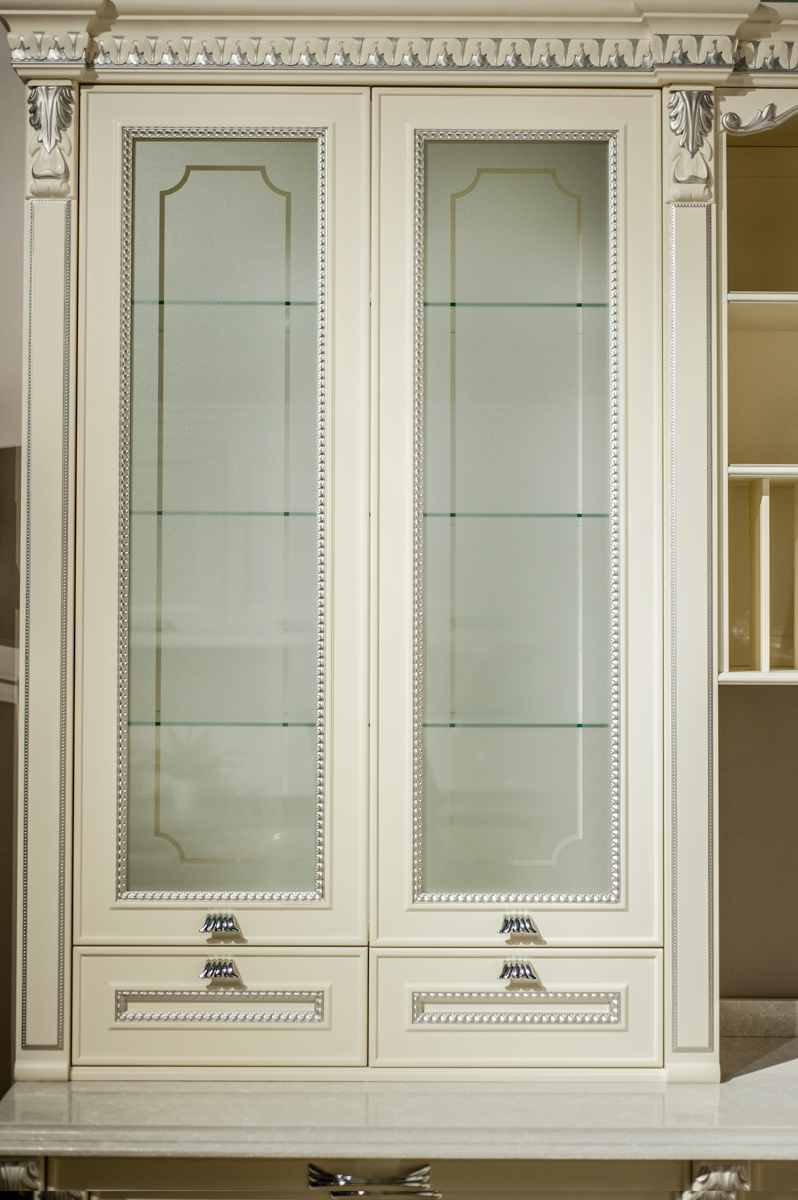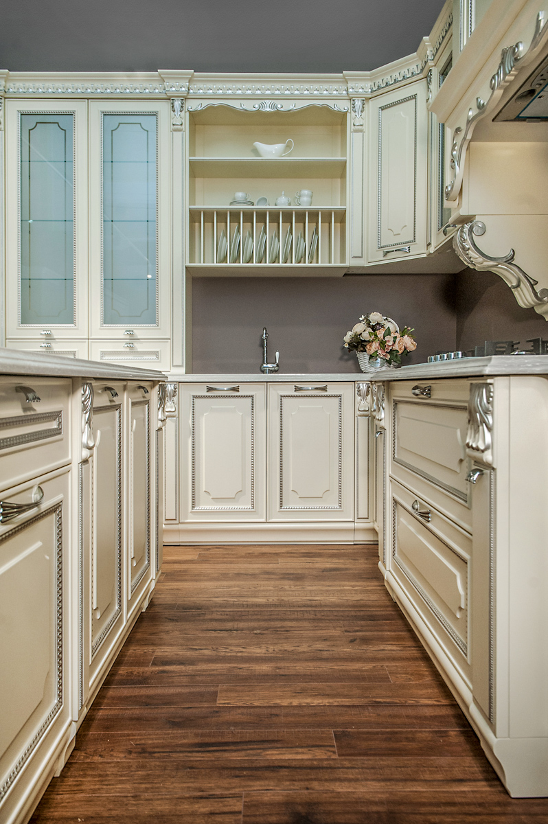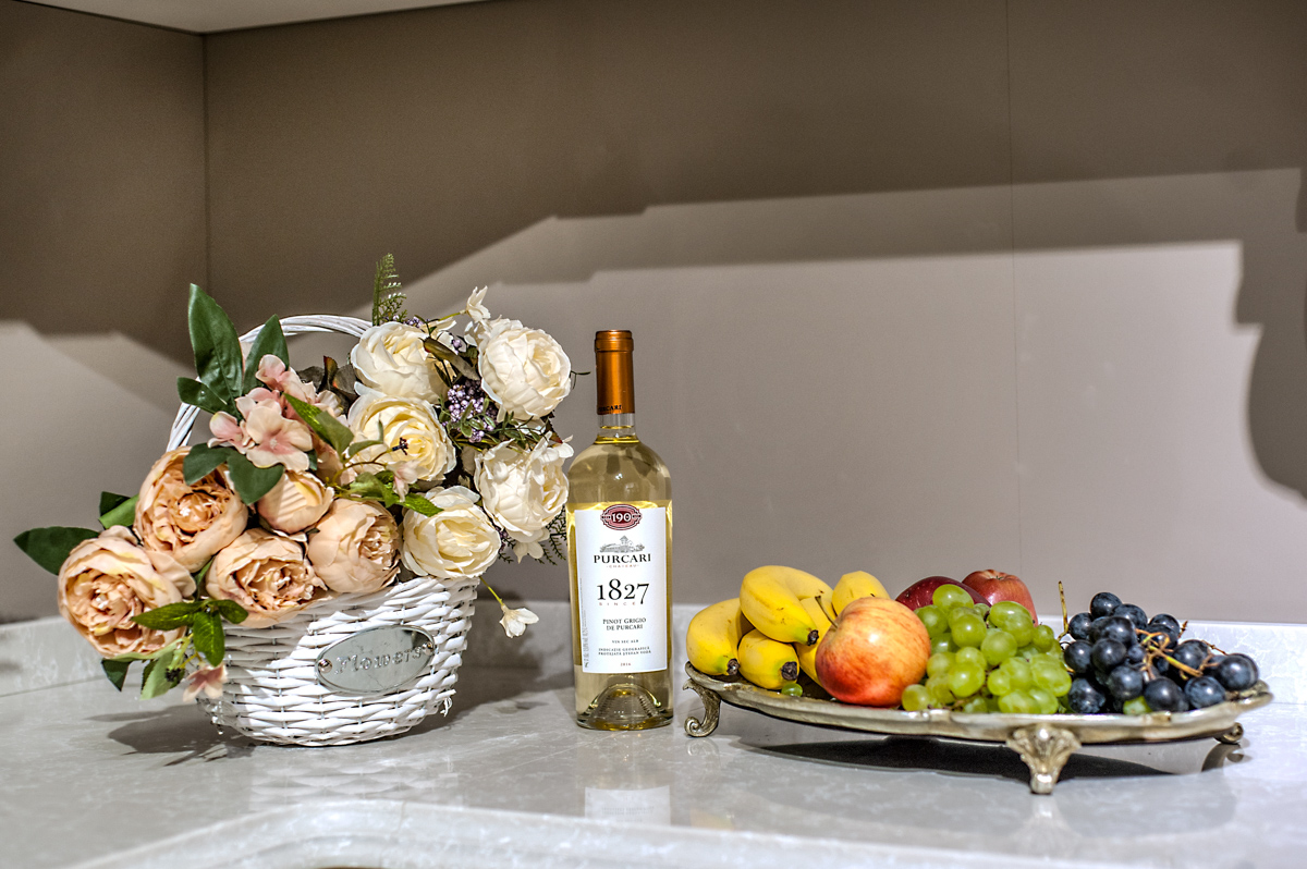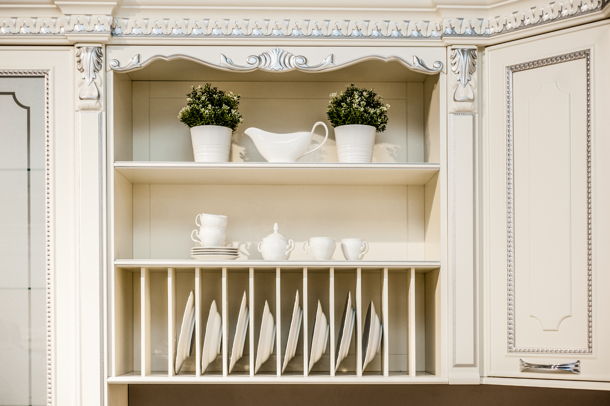 O bucătărie cu nuanțe de culori deschise, combinată ornamente decorative ce ii oferă un aspect respectuos și comod pentru a găti.
